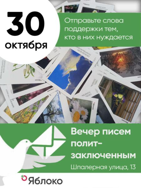 «Яблоко» проводит вечера писем политическим заключённым в конце каждого месяца по всей стране, адрес и время проведения акции в вашем регионе можно узнать на сайте партии.