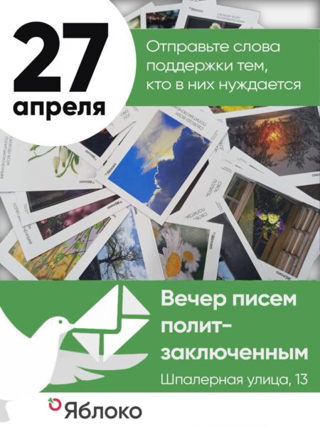 «Теперь я понимаю, какую мощную поддержку оказывает даже самое короткое письмо или самая простая открытка». 27 апреля – вечер писем политзаключённым в Петербургском «Яблоке»